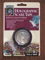 Birds-Away Holographic Tape is used by commercial growers to protect vulnerable crops from birds. When stretched along the perimeter of a field or garden at a height of 3', the tape flashes dramatically in the sunlight, vibrates in the wind and frightens away birds which flee from the simulated fire. The wider, sturdier, all-silver tape (3/4" x 100') holds up under heavy winds. The Bird Away Tape is easy to use and quite effective. This tape is iridescent and holographic.