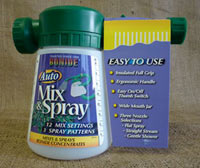 This Hose-end Sprayer automatically mixes and applies the proper water to product dilution. SImple to use. No mixing, no measuring necessary. Unsued contents can be returned to the original container. No Waste! Sprayer has 12 settings, 3 spray patterns: Flat fan for lawns, straight stream for trees, and gentle shower for tender foliage and blooms. Ideal for insecticide, fungicide, herbicide and fertilizer concentrates.